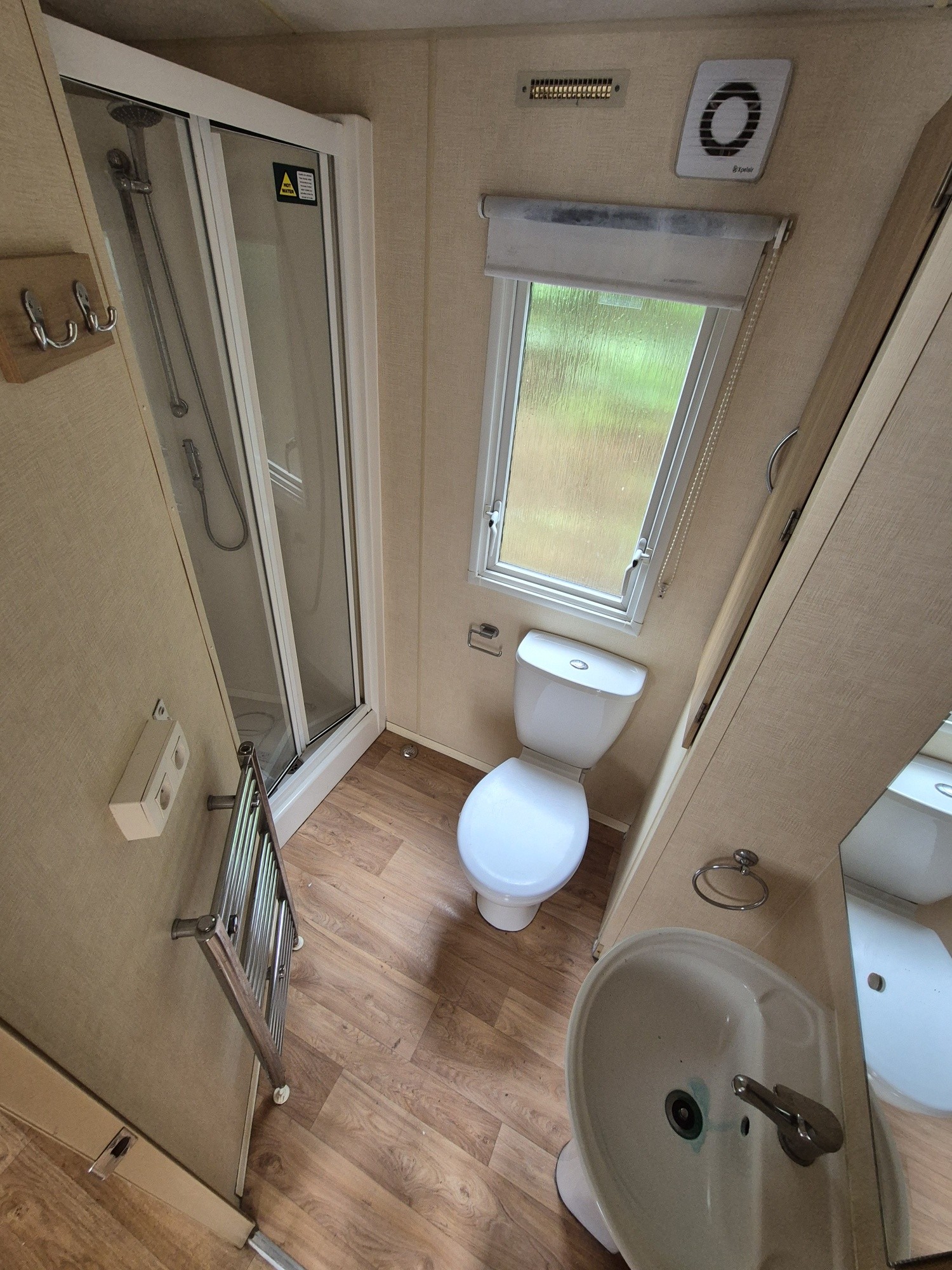 Badkamer met toilet, douche en wastafel.